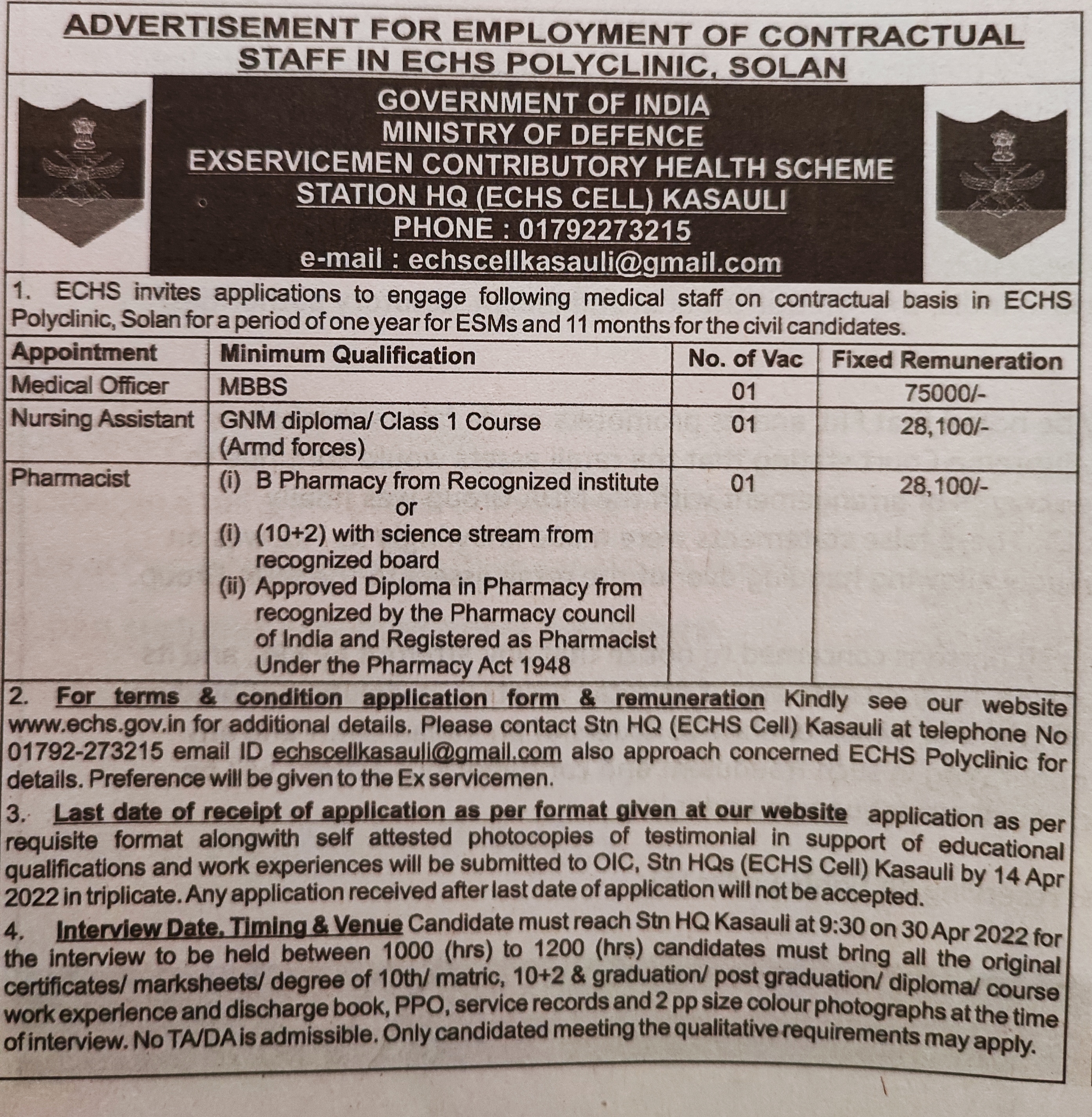 Advertisement for employment of Contractual staff in ECHS Polyclinic Solan