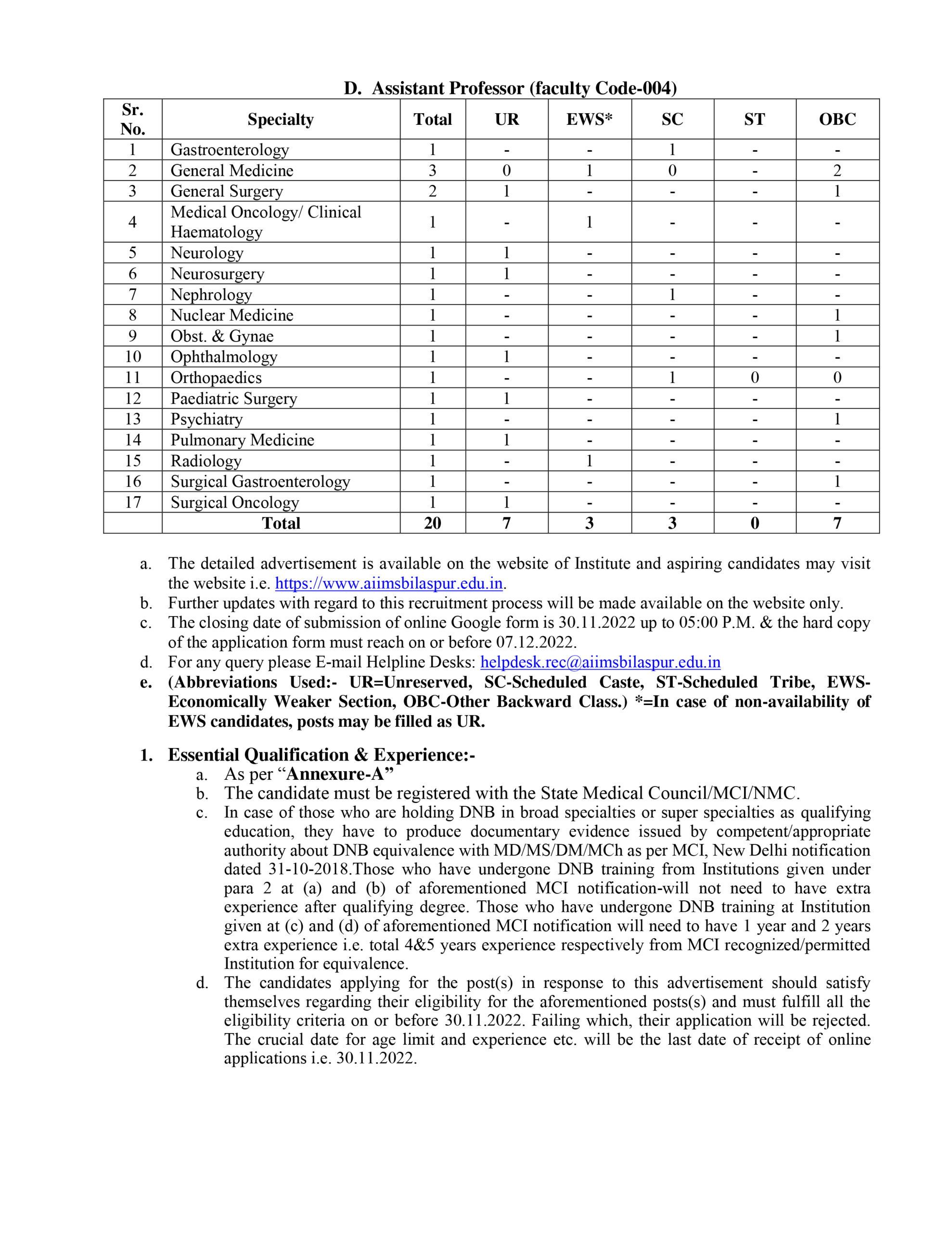 Faculty Detailed Advertisement with Application Proforma and Annexure-I